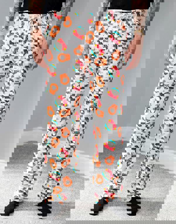 The grey trousers come in an all-over print style featuring Eric Cartman and Kenny McCormick with the South Park logo.