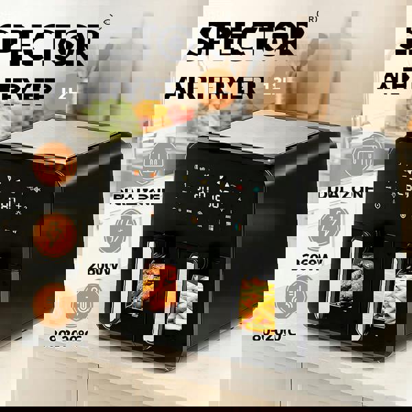 Enjoy flexible and healthy home cooking with this Spector dual basket air fryer. Designed with two independent 6L baskets it provides a generous total capacity of 12L making it ideal for preparing family meals or cooking multiple dishes at the same time.