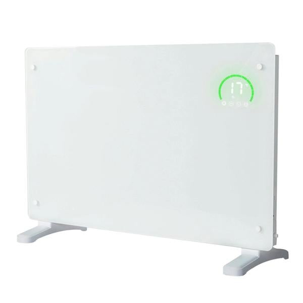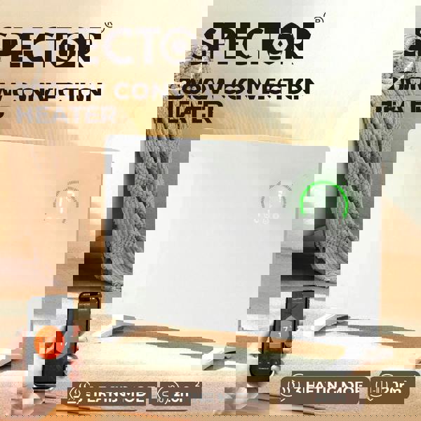 This Spector smart glass panel heater is designed for efficient home heating with modern control and safety features. Featuring a slim white tempered glass body sized 77cm×24cm×51cm it suits bedrooms living rooms and home offices. The 2000W electric heater offers three heating modes including comfort eco and anti-frost ensuring warmth while saving energy. Aluminium heating enables fast heat distribution while the large LED display and touch control provide easy operation.