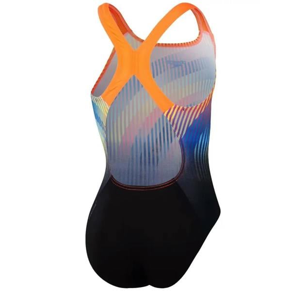 This Girls Digital Placement Powerback Swimsuit from Speedo, has a stunning chequered flag inspired print in coral red, cobalt and lemon on a background of black. Perfect for young swimmers, the powerback free up arms and shoulders for swimming, making it ideal for swimming training sessions. The Endurance+ fabric is made from 100% post consumer waste, such as recycled plastic bottles and is 100% chlorine resistant and is quick drying.