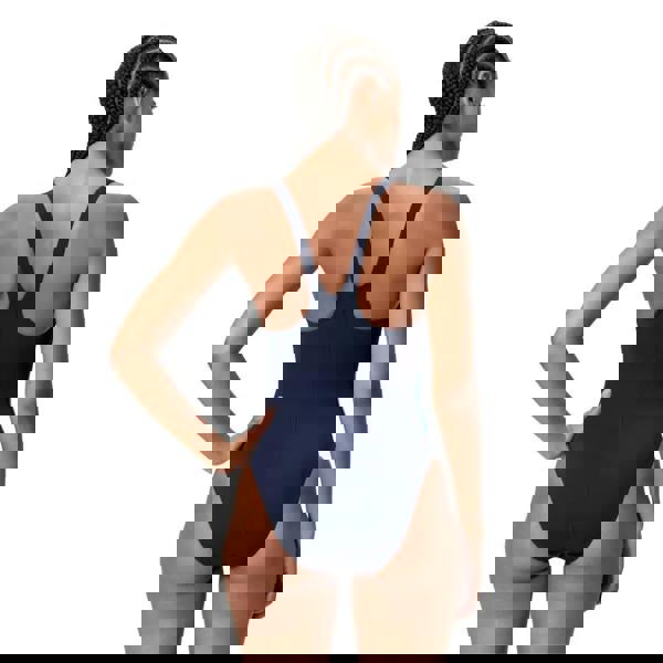 The Hyperboom Butterfly Back from Speedo is a one-piece swimsuit, engineered for serious swimmers. Constructed from Endurance Pro fabric with a dynamic flash on a background of navy blue. With four-way stretch technology, this suit delivers exceptional chlorine resistance and maintains its integrity through repeated use. The distinctive butterfly back design incorporates a strategic keyhole cut-out to facilitate full range of motion during active swimming. Offering traditional moderate coverage, the suit combines 57% recycled polyester with 43% recycled polyester PBT for a sustainable, high-performance construction that resists pilling and maintains shape season after season.