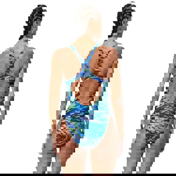 The Hyperboom Print Medalist from Speedo combines performance with style, featuring a striking abstract blue pattern from the renowned Hyperboom collection. Built with Endurance Pro fabric offering four-way stretch, this swimsuit delivers exceptional chlorine resistance and maintains its appearance through repeated wear. The medalist back design optimises shoulder mobility, while mid-coverage cut provides balanced support for active swimmers. Crafted from 57% recycled polyester and 43% recycled polyester PBT, it represents a sustainable choice without compromising on durability or comfort.