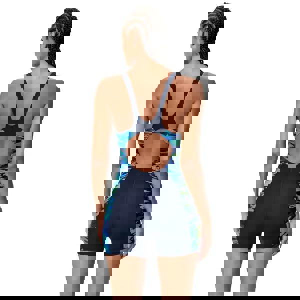 Built for serious swimmers, this Speedo Hyperboom Splice Muscleback Legsuit in navy, combines performance with sustainability. The Endurance Pro fabric delivers exceptional chlorine resistance and resists pilling, ensuring your suit maintains its integrity through countless training sessions. Four-way stretch technology works seamlessly with the muscleback cut to maximise shoulder mobility and streamline your stroke. A supportive underbust elastic provides subtle compression without restriction, while the legsuit silhouette offers complete coverage for lap work. Crafted from 57% recycled polyester and 43% recycled PBT, this navy design with striking blue graphics represents a commitment to both athletic excellence and environmental responsibility.