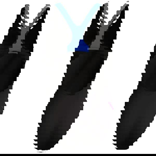 The Women's Placement Laneback Swimsuit from Speedo features contrast straps in blue and splices of Zoom Boom print add splashes of colour in blues and pinks on a classic background of black. The Laneback design offers flexibility, with a supportive elastic bust underband/shelf bra and PBT liner to help minimise bust movement. Quick-drying Endurance+ Max fabric offers high chlorine resistance and durability, so you can swim-wash-repeat.