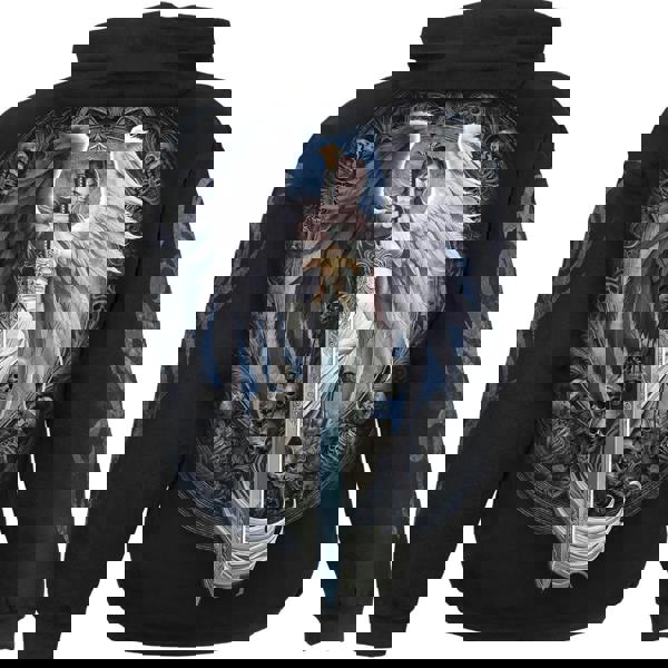 Half bathed in ethereal light and half sunken in nefarious shadow, an angel warrior with wings unfolded, holds her intricately-crafted sword at arms’ length, blade facing down from the heavens towards the earth below, where lowly mortals wage their own war between good and evil. A mournful border of skeletons surrounds her, with skulls tied to her waist.