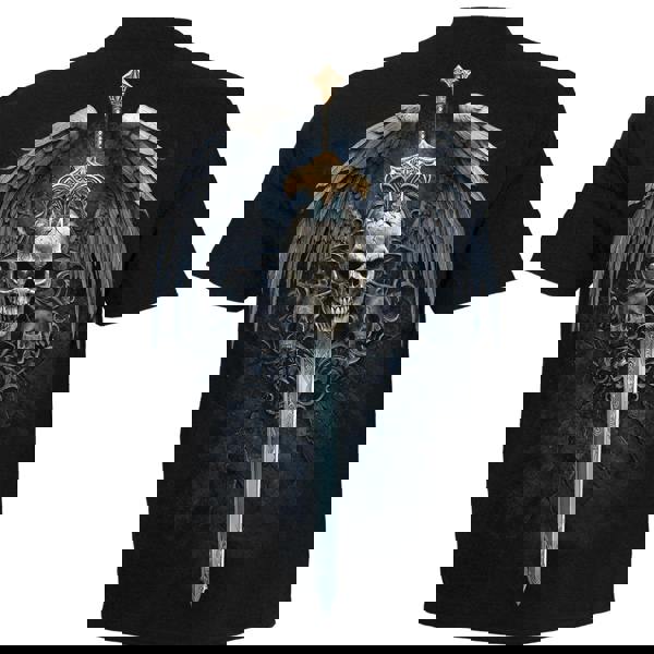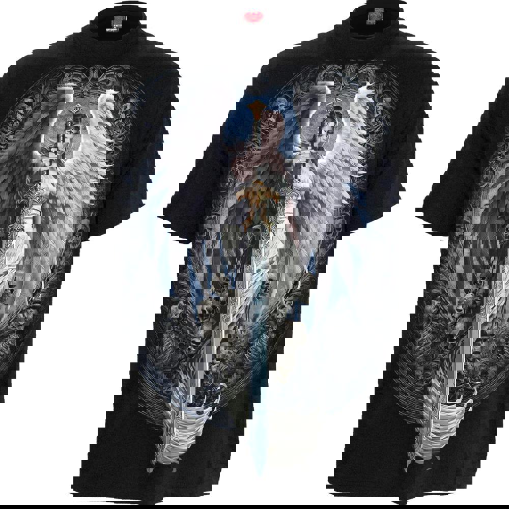 Half bathed in ethereal light and half sunken in nefarious shadow, an angel warrior with wings unfolded, holds her intricately-crafted sword at arms’ length, blade facing down from the heavens towards the earth below, where lowly mortals wage their own war between good and evil. A mournful border of skeletons surrounds her, with skulls tied to her waist.