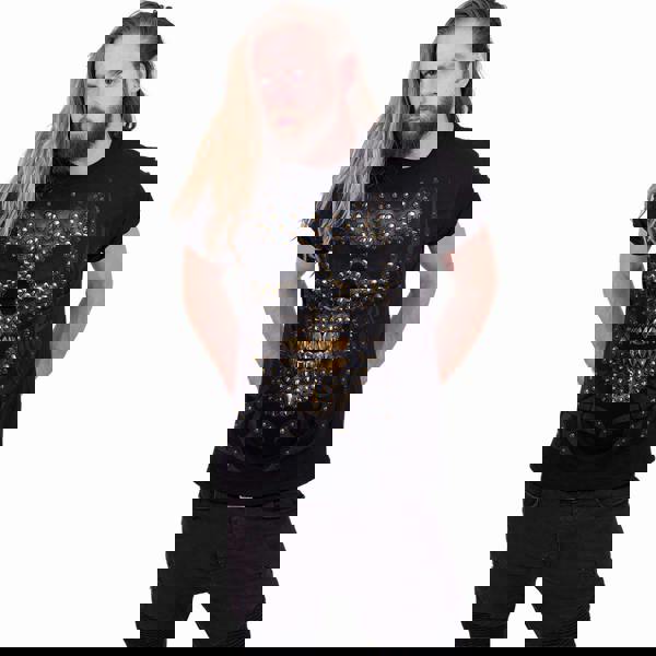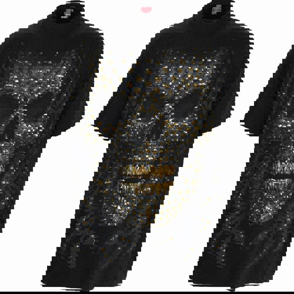 The ink-black pallor of midnight envelopes a skull in the darkness, accentuated with tribal engravings and the shimmer of molten gold. Death finds no solace in the decaying fortunes of the afterlife.