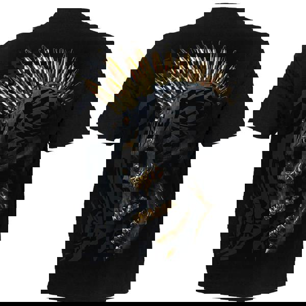 The ink-black pallor of midnight envelopes a skull in the darkness, accentuated with tribal engravings and the shimmer of molten gold. Death finds no solace in the decaying fortunes of the afterlife.