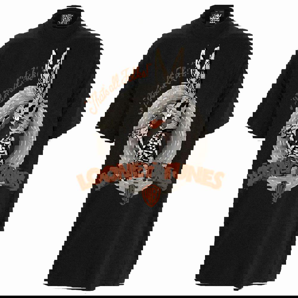Official licensed Warner Brothers product. A skeletal Bugs Bunny emerging from the iconic Looney Tunes circles. That’s All Folks!