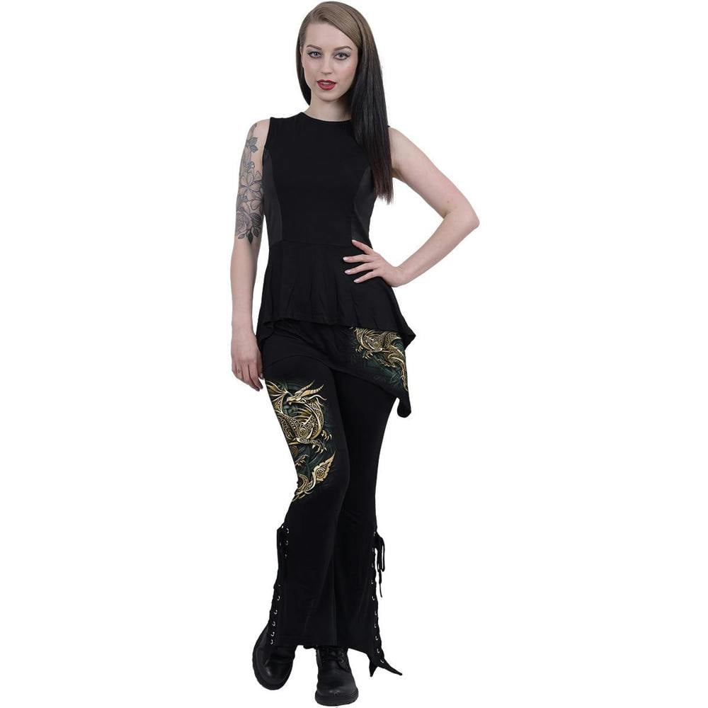 The echoes of history ring loudly through this stunning, intricate design of a majestic golden dragon in flight. Wings outspread, and tail gracefully sweeping underneath its serpentine form, this dragon sits elegantly on top of an aged Celtic knotwork backdrop, as if it were a pendant unearthed after being buried for centuries.