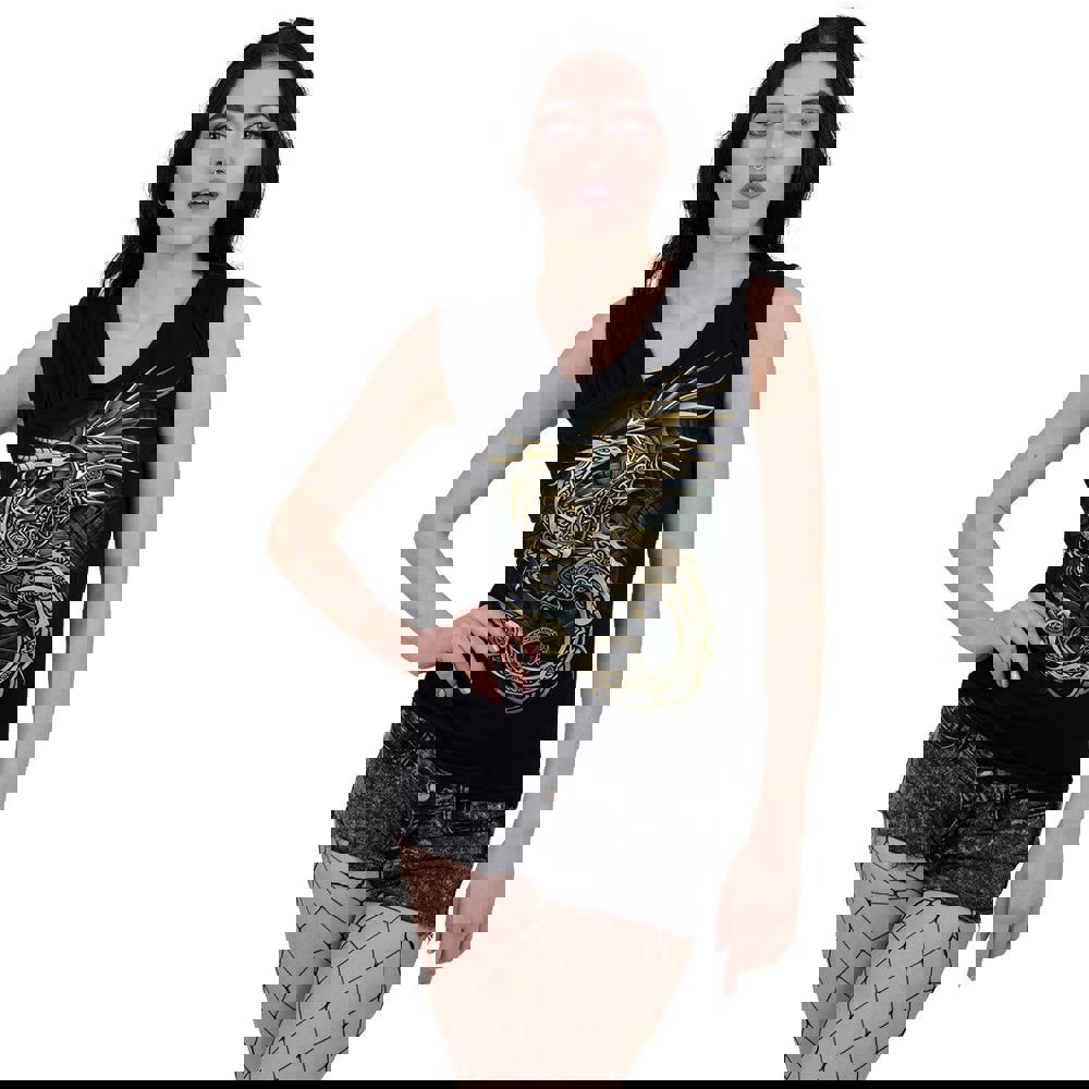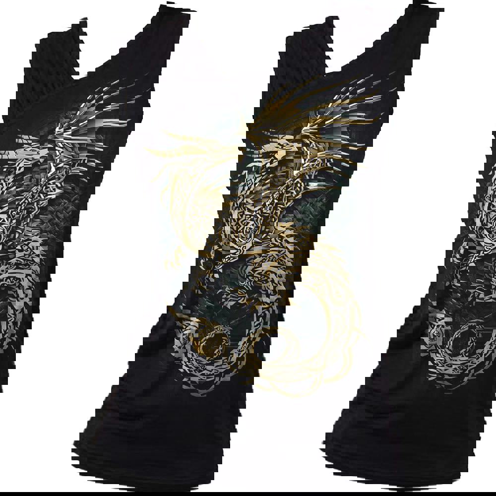 The echoes of history ring loudly through this stunning, intricate design of a majestic golden dragon in flight. Wings outspread, and tail gracefully sweeping underneath its serpentine form, this dragon sits elegantly on top of an aged Celtic knotwork backdrop, as if it were a pendant unearthed after being buried for centuries.