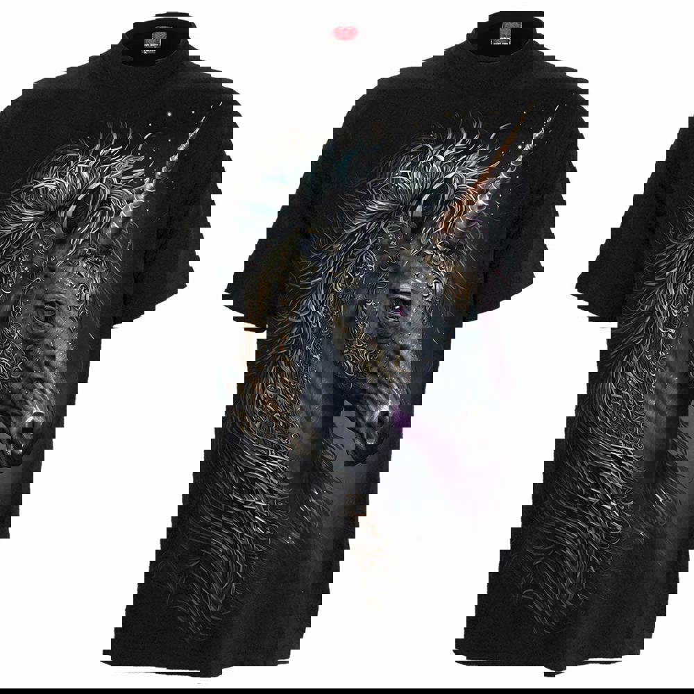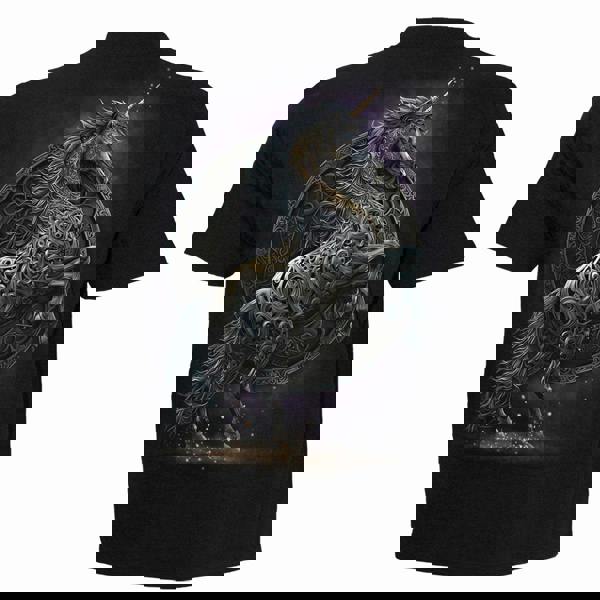 Spiral Direct Celtic Unicorn - T-Shirt Black brings a mythical scene to everyday wear, capturing a unicorn emerging through broken moonlight among winter trees, moss and bracken. The artwork creates a dramatic, atmospheric look that suits fans of fantasy imagery and statement graphic tees.