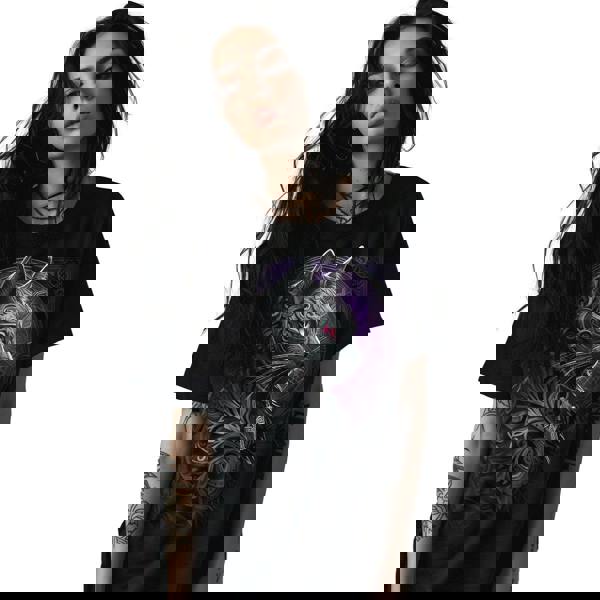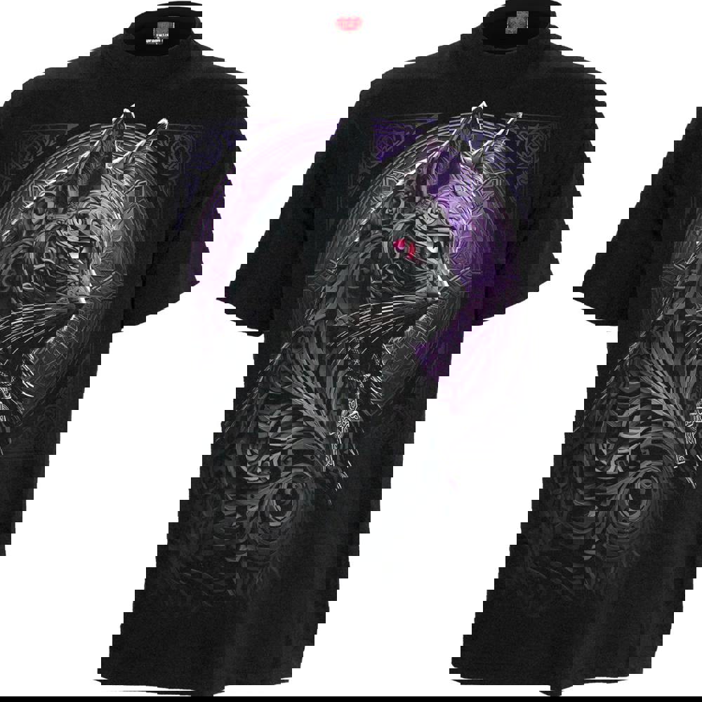 The haunting image of a cat, black as the night that surrounds her, complete with Celtic flourishes that frame her face and create a design of grandeur and serenity. Cat lovers will do well to add this beautiful garment to their collection