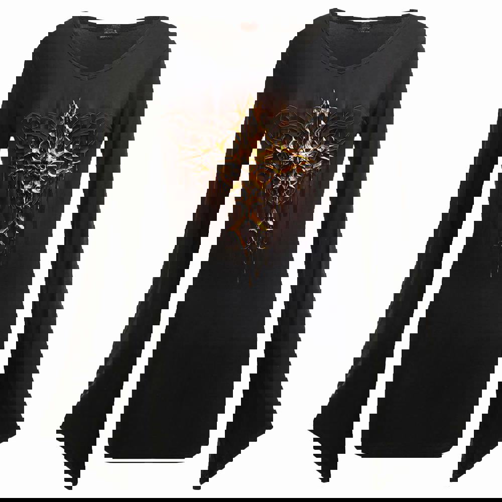 Behold this molten metal masterpiece! A skeletal smile glints through the all-encompassing gloom. Fire up the furnaces of the Underworld and pour this 24-carat terror onto your frame. Dripping Gold truly has the Midas touch.