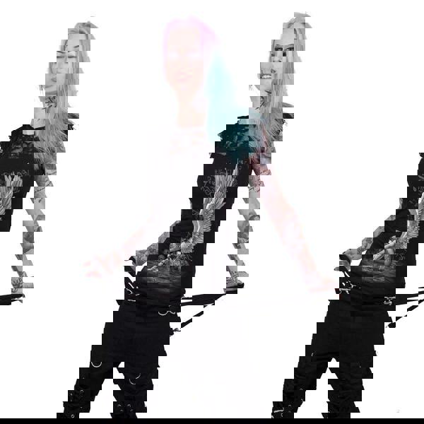 This chained, enslaved angel sits with her head hung in sorrow in the middle of a pentagram, surrounded by skulls of the dead.