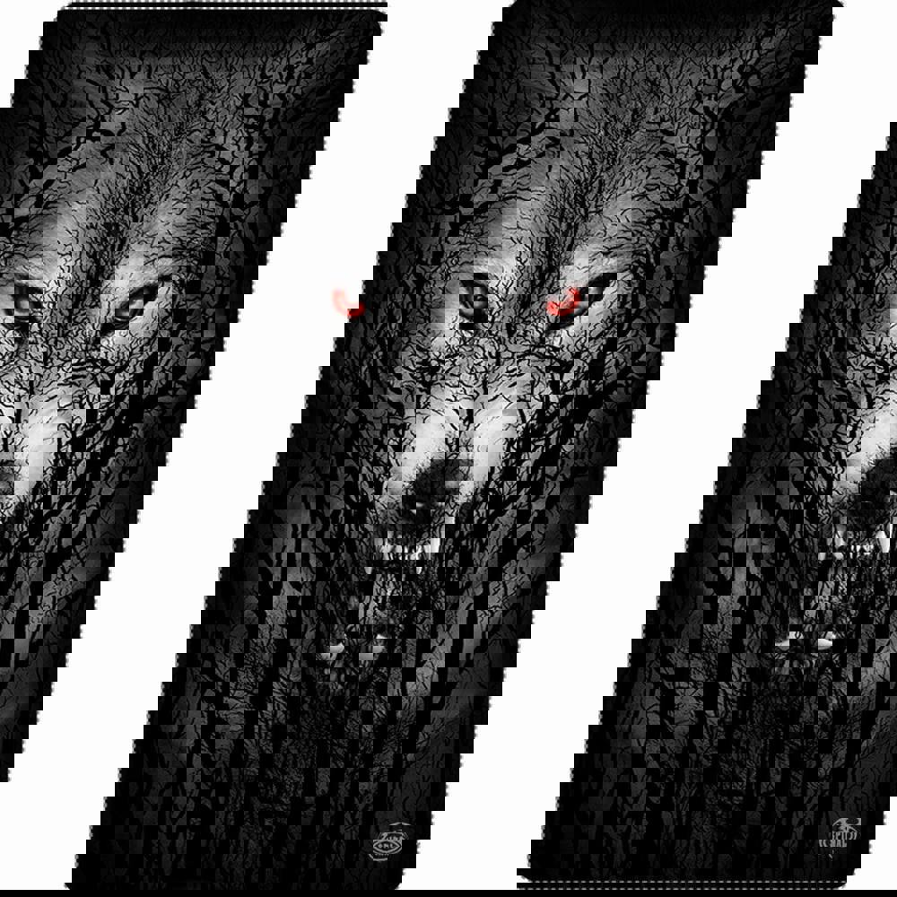 A menacing shape emerges in the nocturnal landscape – a snarling, howling wolf within the trees, with blood-red eyes and gleaming teeth. The spirit of the hunt is alive and hungry.