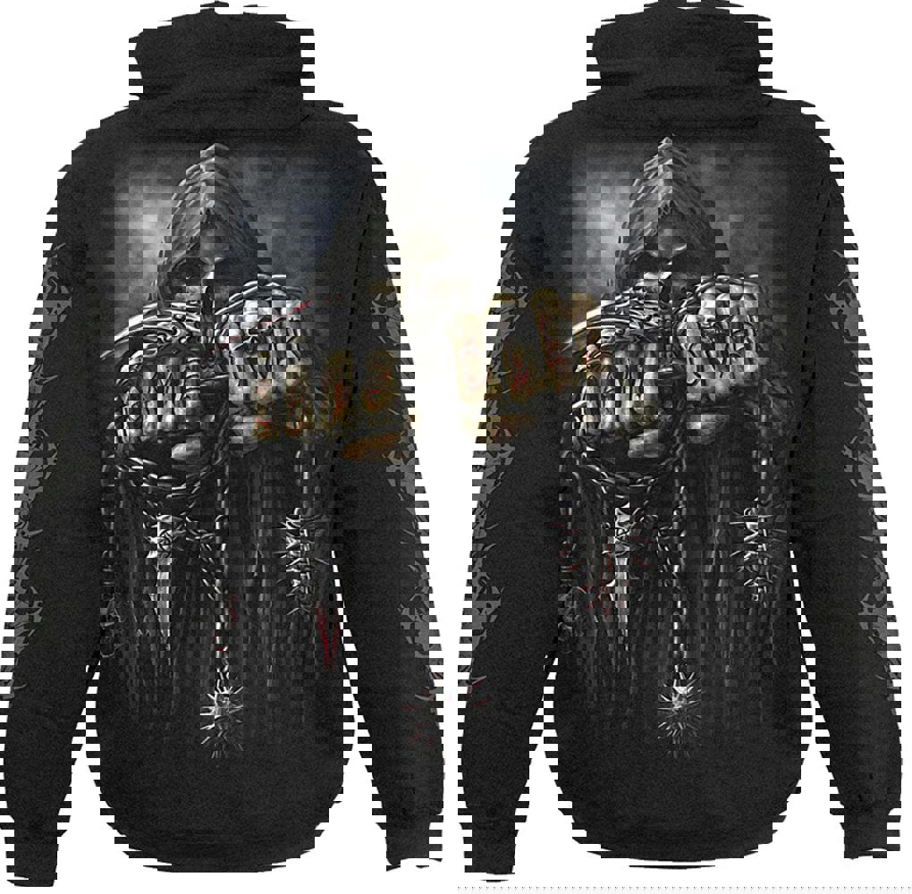 You know it is Game Over if you see this skeleton Reaper with his carved knuckles. Tribal back print with You Lose carved in to the skull s forehead.