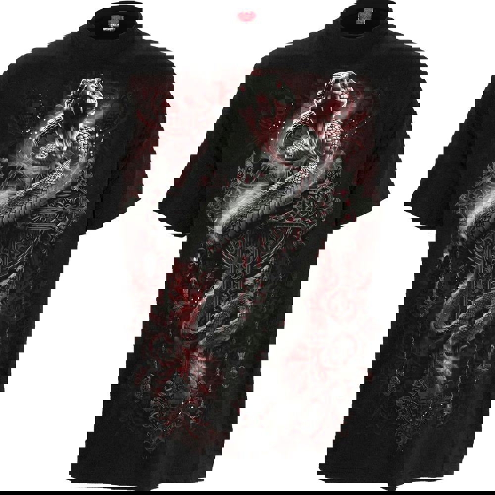 Coiled around an ornately cast silver cross, this venomous snake is poised to strike; needle-sharp fangs bared, tail rattling aggressively, and a long, forked tongue whipping the air with menace. Its crimson eyes reflect the colour of the twisting, organic gothic patterns that complete a truly atmospheric composition. Let this serpentine design sink its teeth deep into your soul.