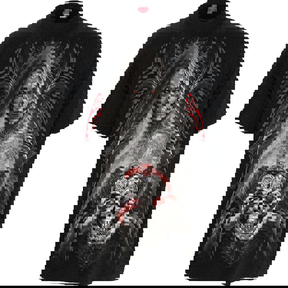 Death is as much a part of life as birth and thus equally sacred. Follow the high priestess to the temple and lay your offerings at the shrine of Santa Muerte. Offer up your prayers and pay your respects to the lady of the dead that you may be granted her divine protection. T-Shirt Black is made of Top Quality 100% Cotton, Jersey using skin friendly, Azo-free, Reactive dyes.