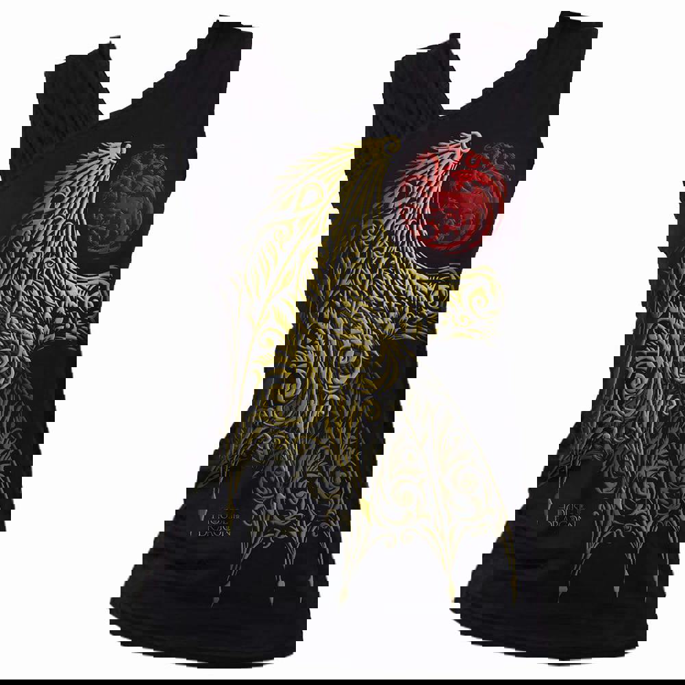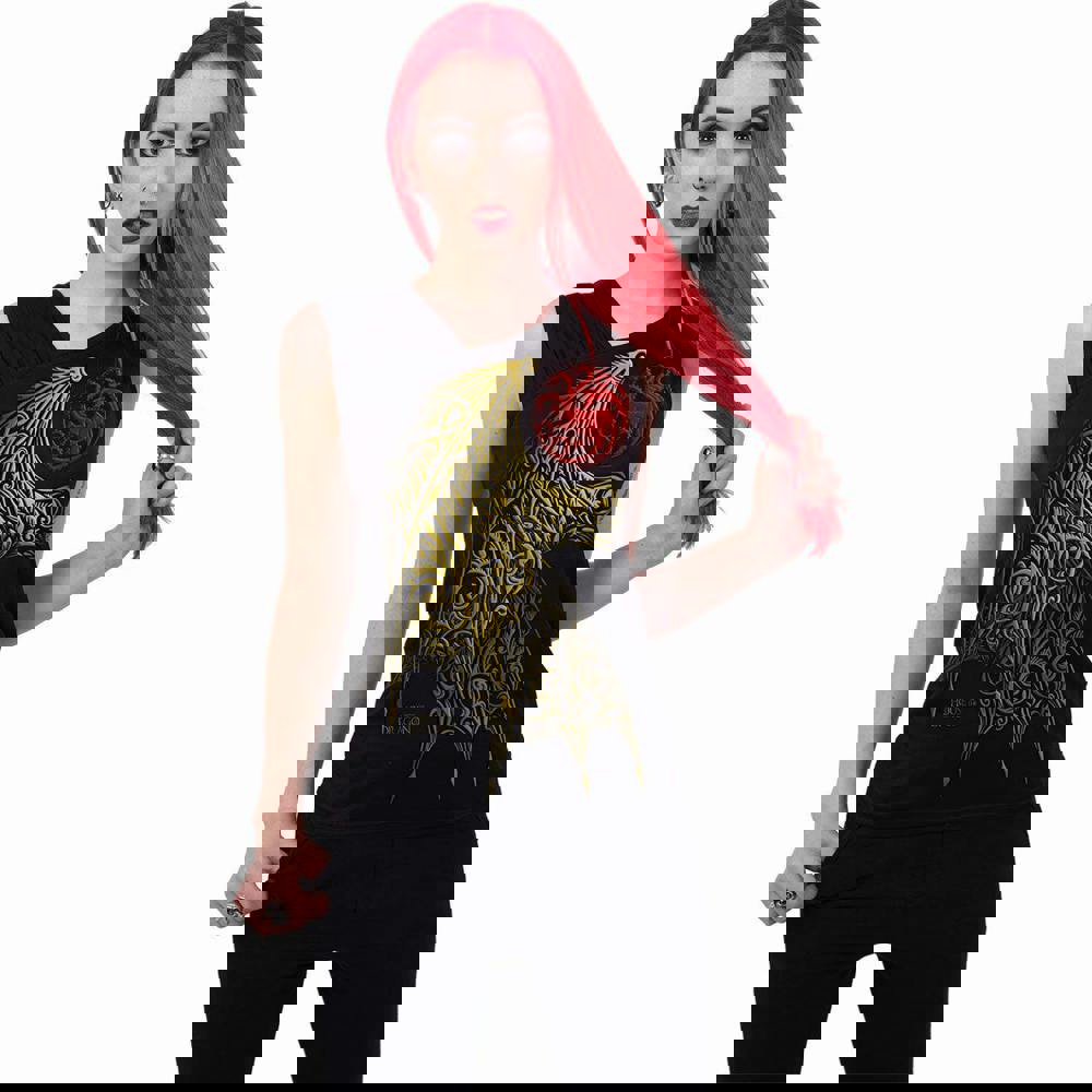 Official licensed Warner Brothers product. Two intricate crossed-over filigree dragon’s wings adorn the front of this garment, along with the Targaryen sigil in blood red.