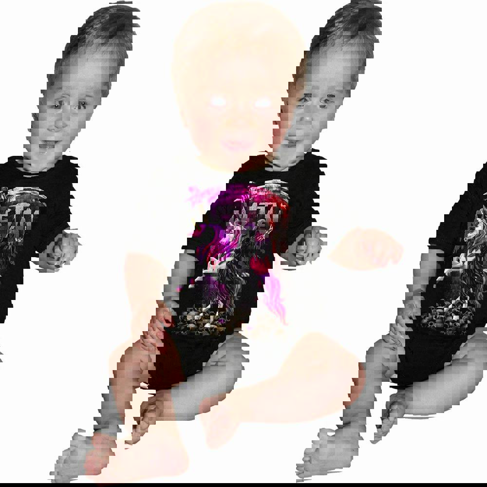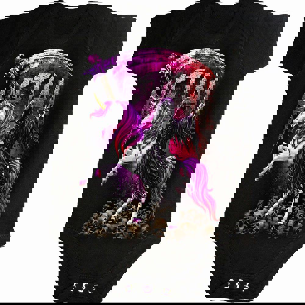 The unholiest trinity of which we never dare to speak. Death, Heavy Metal music and. . . . erm. . . . Unicorns. Throwing up the sign of the devil while his majestic rainbow-coloured steed rears up in a very convincingly aggressive pose, Mr. Reaper’s iPod is definitely blasting out Iron Maiden. Or possibly ABBA. Look fabulous and kill those souls!