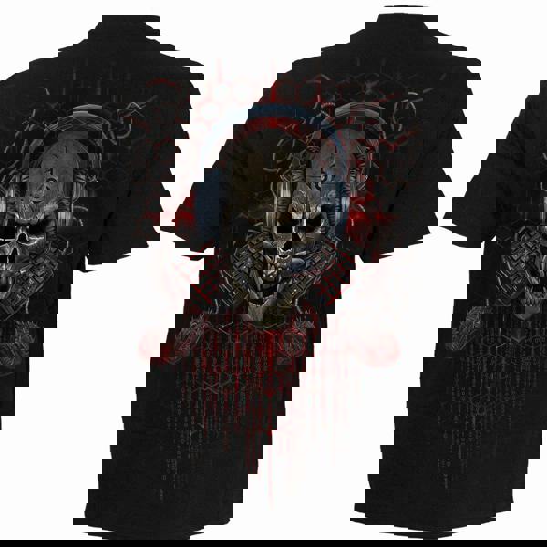 It’s PC gone mad! Bored with killing real people, this furious Grim-Gamer is slamming the absolute qwertee out of his keyboard, raging against his machine and determined to hit a high score reaping virtual souls. A skull and cross ‘boards adorns the back of this computer-worshipping work of art.