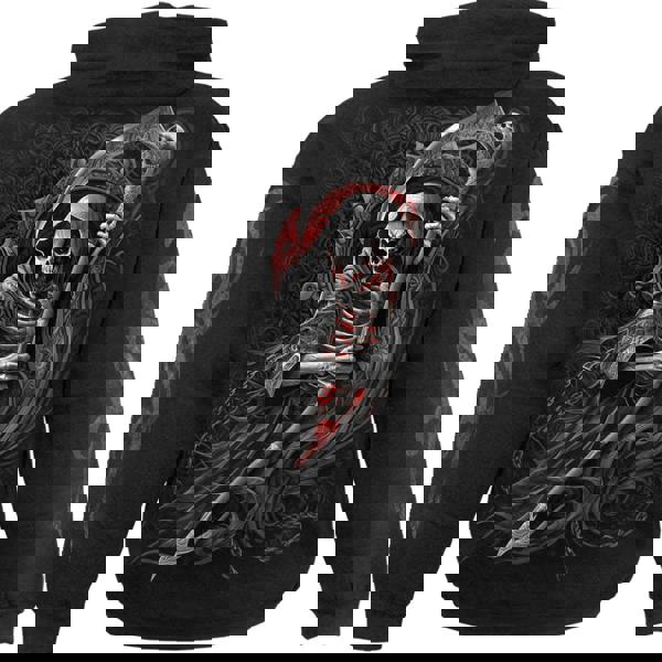 Slicing through the thin veil that separates our realities, the Grim Reaper opens a doorway that can only be passed through once by mortals, for there is no coming back from the afterlife. Intricate feathered patterns wind their way around the edges of the portal, with bolder tribal flourishes in the background. Truly a design for lovers of the macabre.