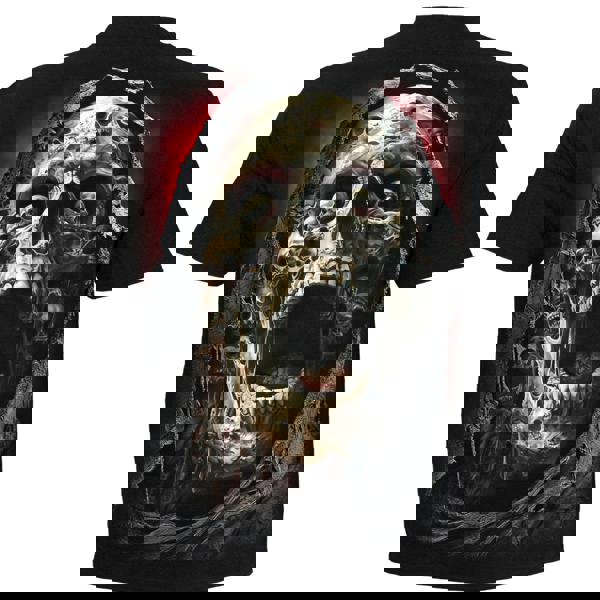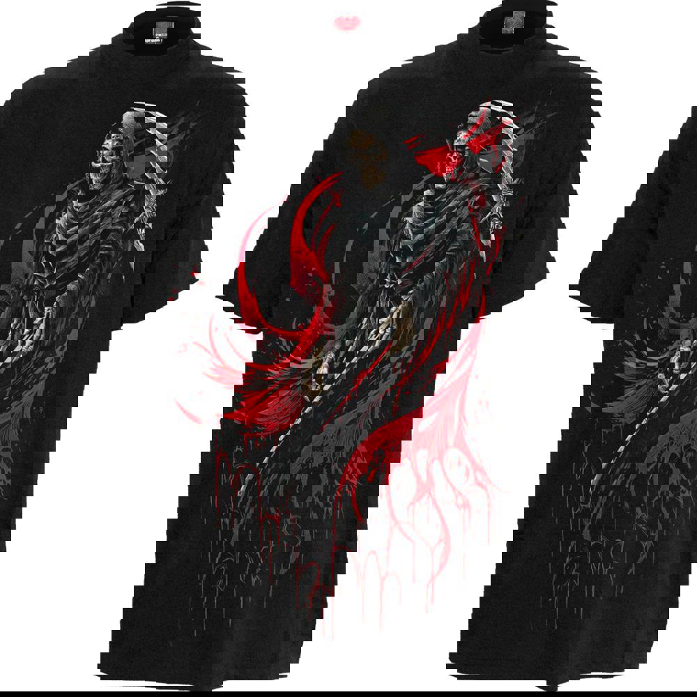 A tortured Grim Reaper, birthed by the fused-together skulls of countless lost souls, slashes his way aggressively through this dark canvas. On the reverse, his sunken eyes are shown to be skulls also, adding to the feeling of unease that this design evokes. Officially Licensed Product. T-Shirt Black is made of Top Quality 100% Cotton, Jersey using skin friendly, Azo-free, Reactive dyes.