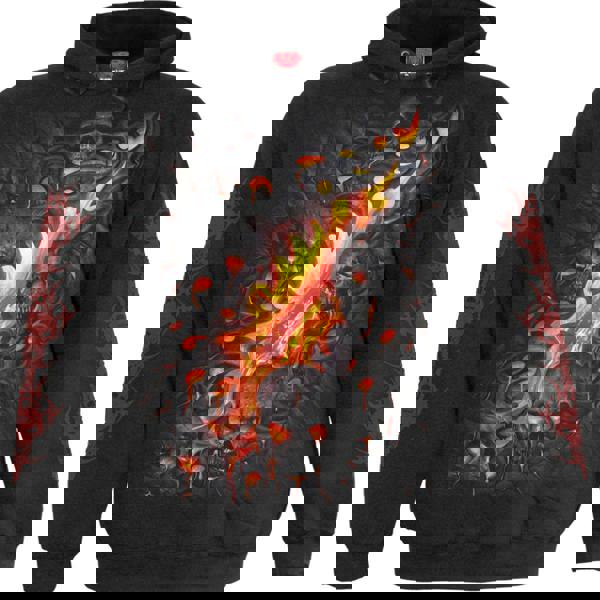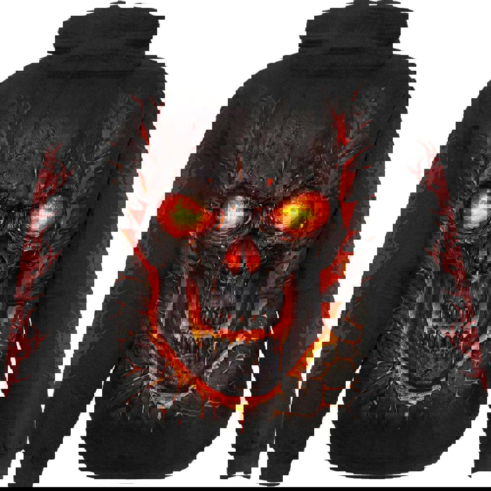 Etched into the melting volcanic rock within the earth’s core, the grotesque mask of death smiles grimly with eyes of molten lava. A skull and tribal back print sets off this eery design perfectly.