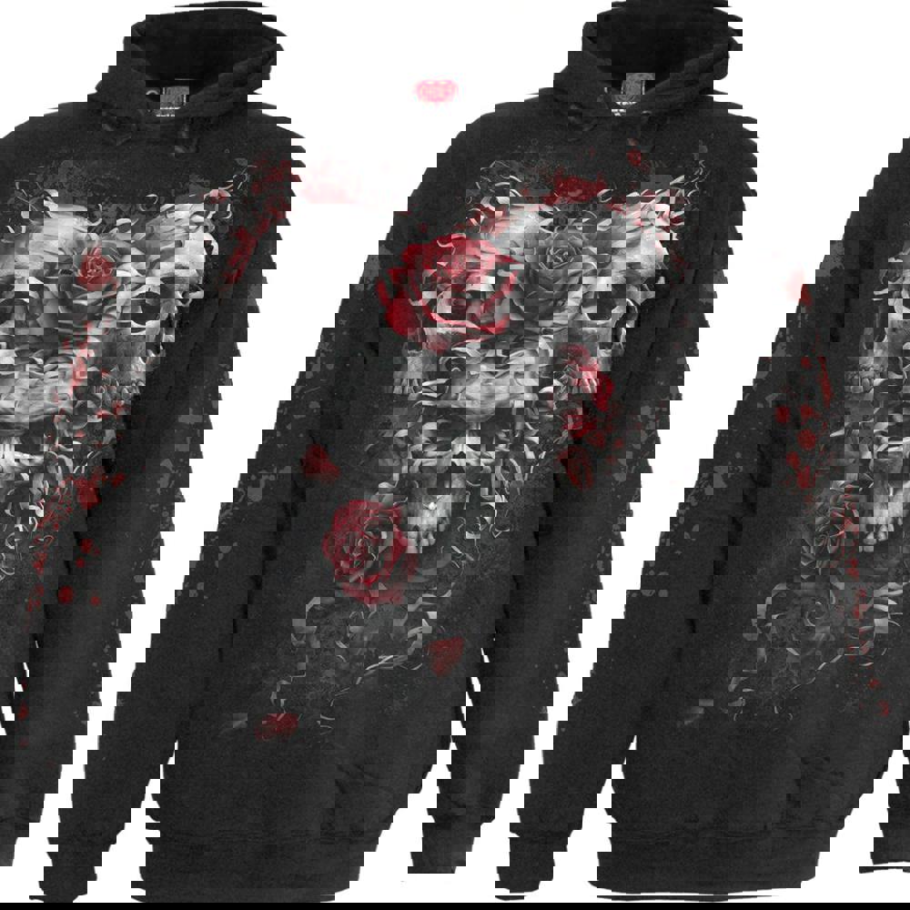 80s rock iconography given a modern twist. Rebellion exemplified, this classic pairing of skulls and roses is perfect for that next heavy metal concert… if you’ve got the appetite.