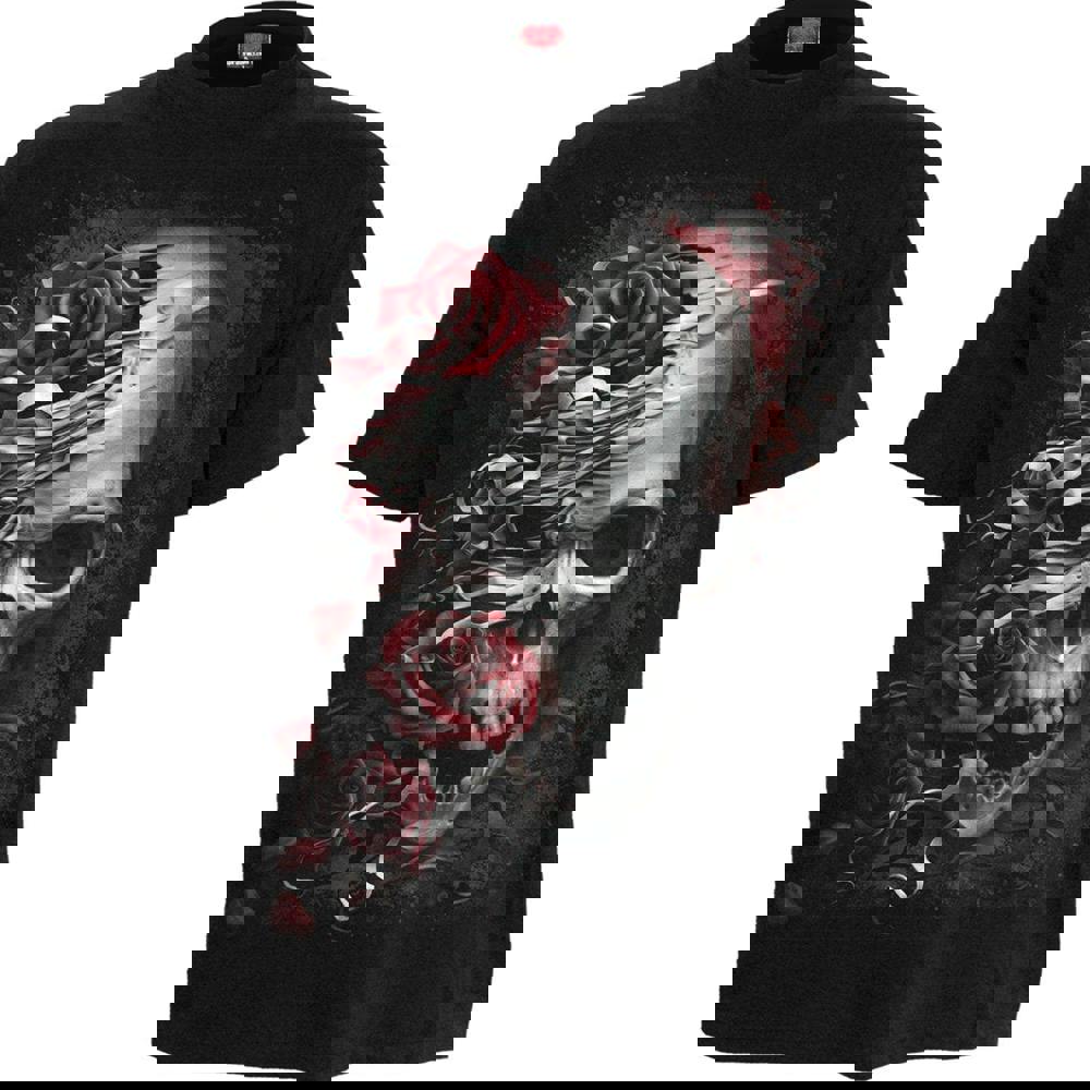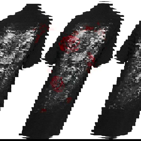 80s rock iconography given a modern twist. Rebellion exemplified, this classic pairing of skulls and roses is perfect for that next heavy metal concert… if you’ve got the appetite.
