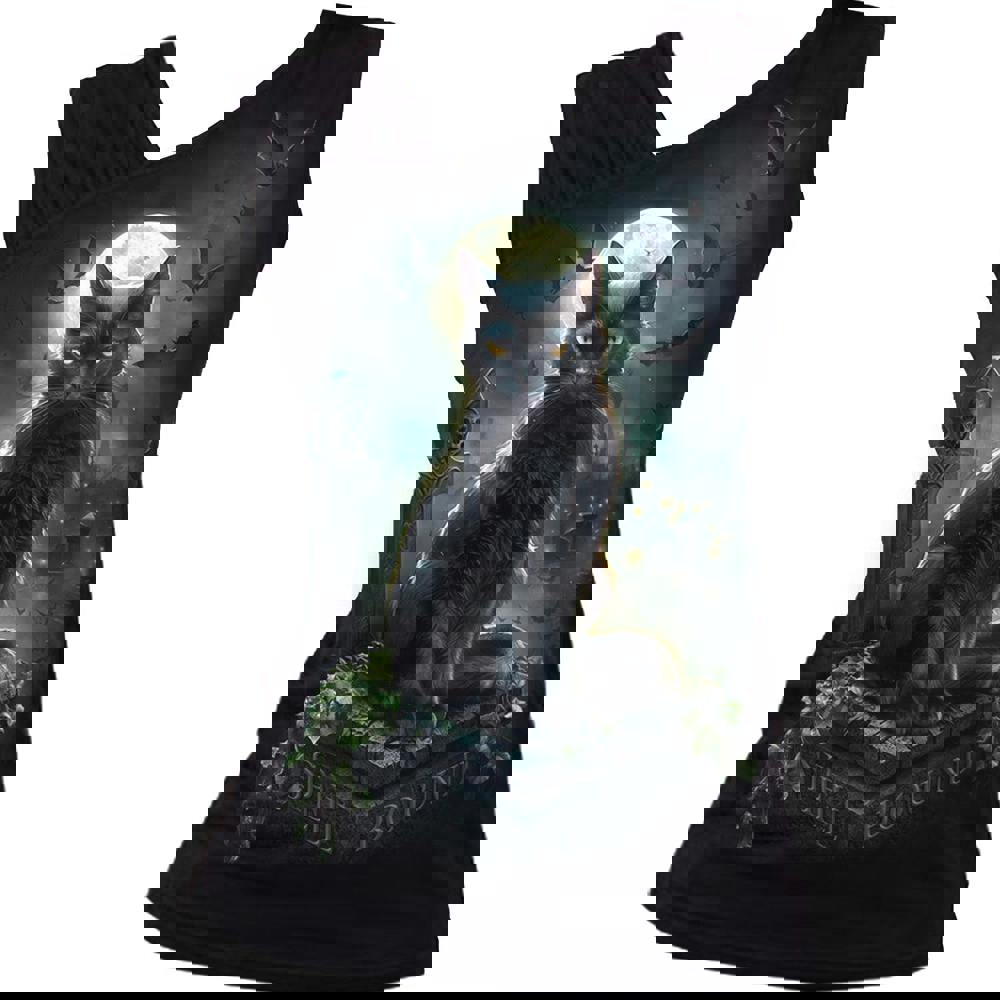 A solemn cat, as black as the night descending on the graveyard, waits patiently on a granite tomb that sits overgrown with ivy and bathed in winter moonlight. Her amber eyes flit from left to right, searching the landscape. Who she is waiting for, one can only wonder, but when they arrive all will be answered.