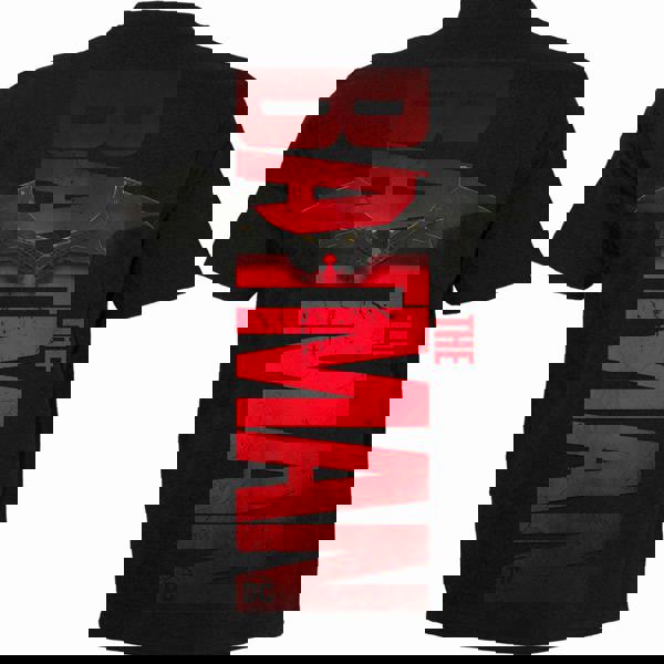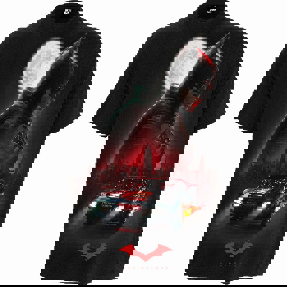 Official Licensed Product from the Warner Bros. DC Universe. A powerful montage image featuring The Batman underneath a full moon, with the Batmobile firing up its engine to prowl the streets of Gotham. Logo with metal bat wings on the back.