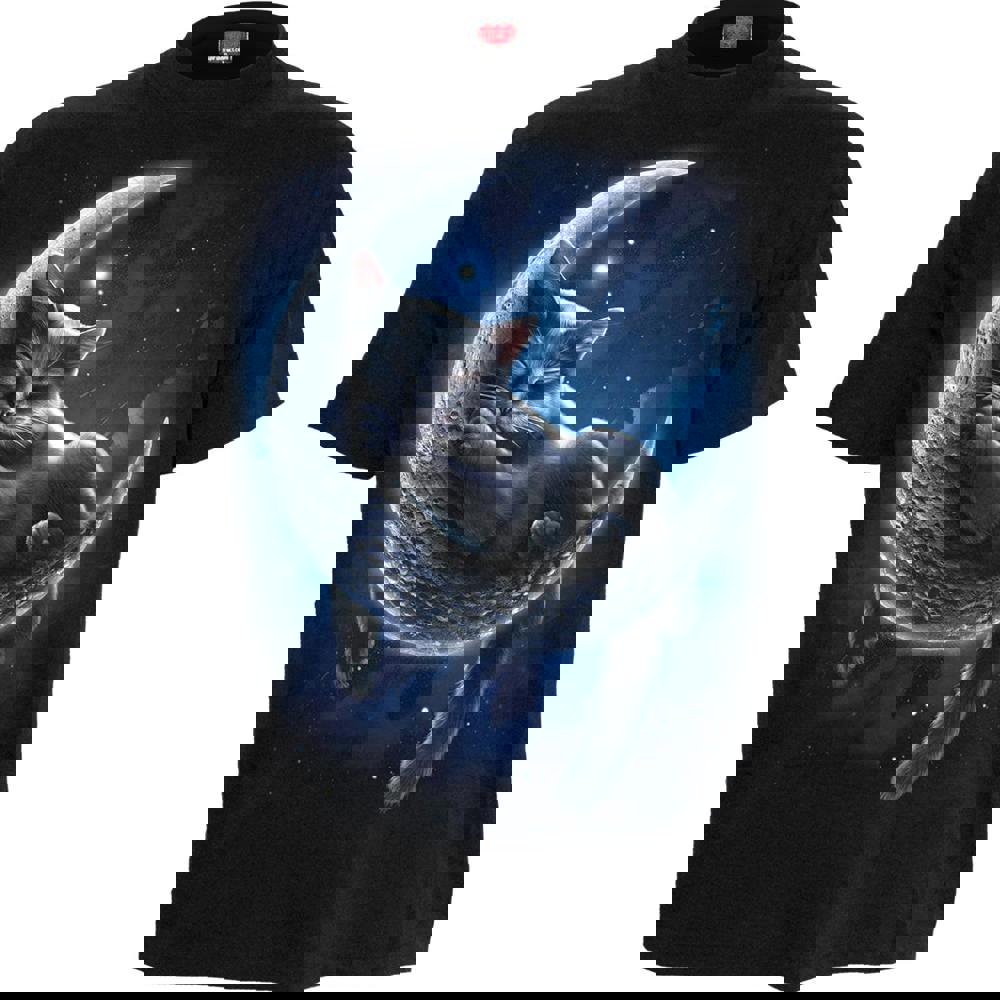 Comfortably nestled in the arms of sleep, this beautiful black cat lays cradled in a crescent moon, with its pale light gently aiding her slumber. A billion stars scattered across the night sky flicker and sparkle as she dreams of secrets that nobody else can touch.