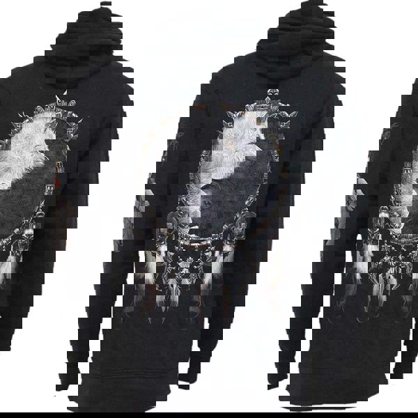 Within nature there is the potential for both good and evil, for light and dark. Both must exist as neither can be anything without the other. Dual wolves entwined within a dream catcher representing Yin and Yang.