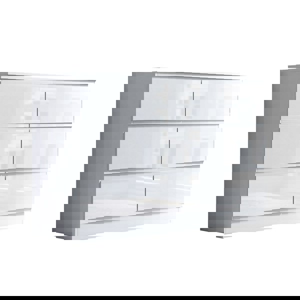 The Carlton chest of drawers features gloss drawer fronts with a matt frame, allowing it to seamlessly complement any room or office decor.
