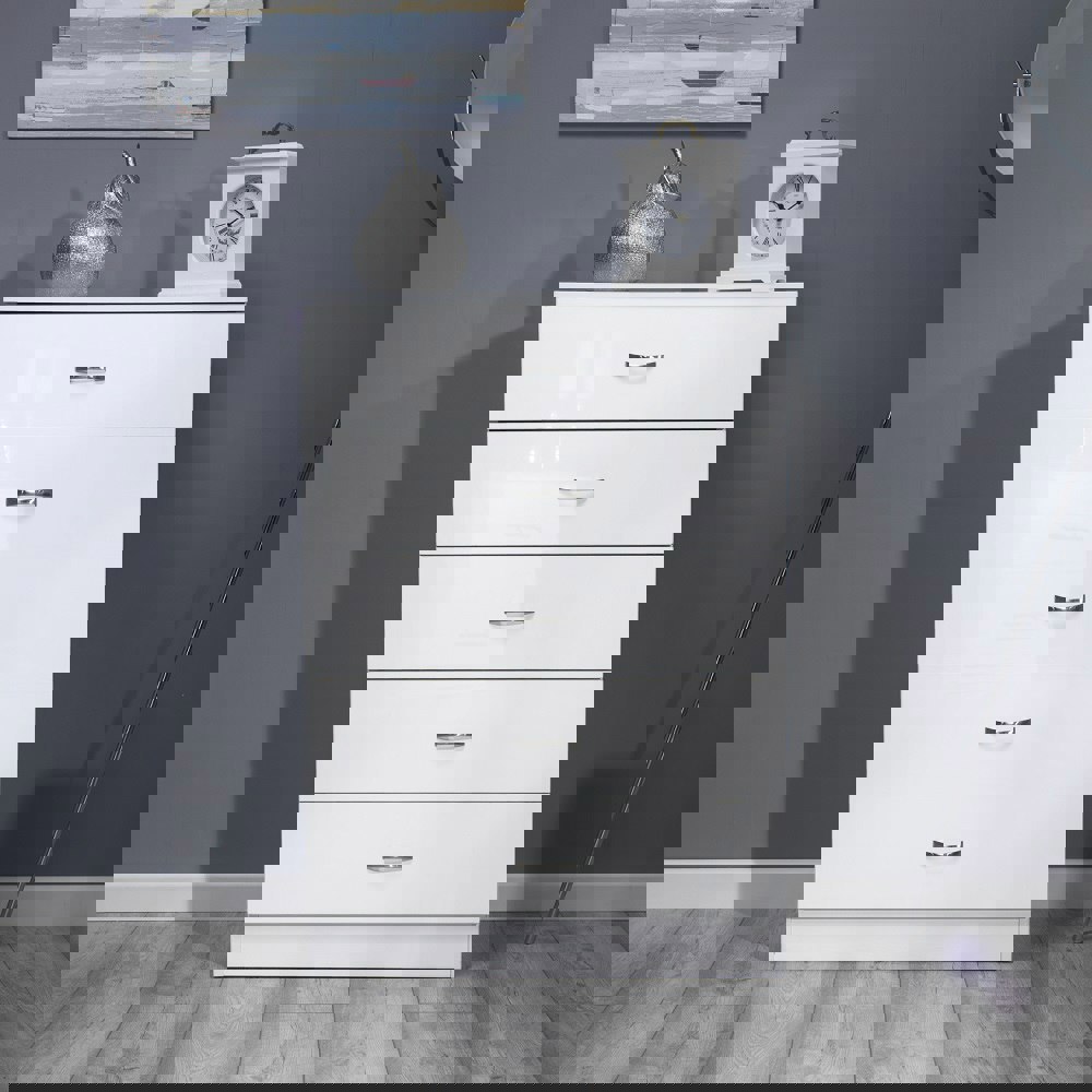 The gloss-finished Chiswick cabinet complements any room or office design. It is easy to clean with a damp cloth and highly resistant to wear and tear. The 5-drawer storage is perfect if you have a lot of clothes or are sharing storage with a partner, offering all the space-saving capabilities you need.