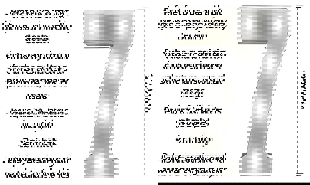 • Battery Operated 3D LED Number LightPerfect for use as a night light or as a party or wedding decorationPurchase any combination of numbers and letters to spell out names
