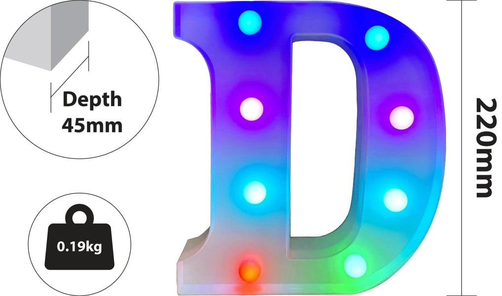 Introducing our vibrant RGB LED sign, a versatile addition to any celebration or ambiance setting. Powered by 2 x AA batteries (not included), this sign offers convenience with an on/off switch for easy operation. It comes complete with a user-friendly full-function timer remote control (powered by 1 x CR2025, not included), allowing precise control over colour selection, 9 program options, speed adjustments, and auto mode. Perfect for creating captivating night lights, enhancing parties, weddings, anniversaries, and birthdays, this sign provides endless opportunities to spell out names and ages with colourful flair. Elevate your events with the dynamic lighting possibilities of our RGB 9 LED sign.
