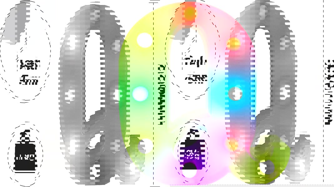 Introducing our vibrant RGB LED sign, a versatile addition to any celebration or ambiance setting. Powered by 2 x AA batteries (not included), this sign offers convenience with an on/off switch for easy operation. It comes complete with a user-friendly full-function timer remote control (powered by 1 x CR2025, not included), allowing precise control over colour selection, 9 program options, speed adjustments, and auto mode. Perfect for creating captivating night lights, enhancing parties, weddings, anniversaries, and birthdays, this sign provides endless opportunities to spell out names and ages with colourful flair. Elevate your events with the dynamic lighting possibilities of our RGB 9 LED sign.