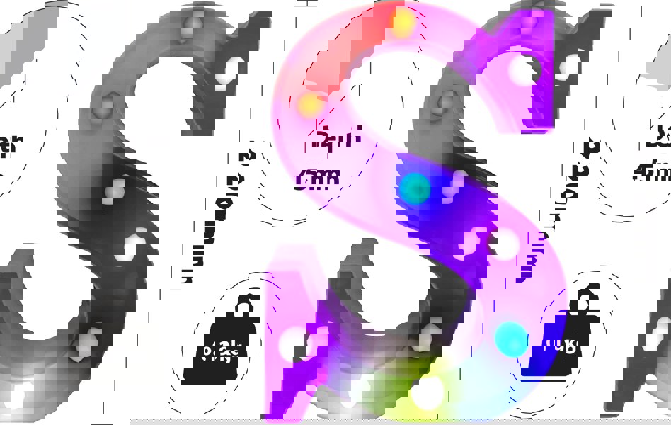 Introducing our vibrant RGB LED sign, a versatile addition to any celebration or ambiance setting. Powered by 2 x AA batteries (not included), this sign offers convenience with an on/off switch for easy operation. It comes complete with a user-friendly full-function timer remote control (powered by 1 x CR2025, not included), allowing precise control over colour selection, 9 program options, speed adjustments, and auto mode. Perfect for creating captivating night lights, enhancing parties, weddings, anniversaries, and birthdays, this sign provides endless opportunities to spell out names and ages with colourful flair. Elevate your events with the dynamic lighting possibilities of our RGB 9 LED sign.
