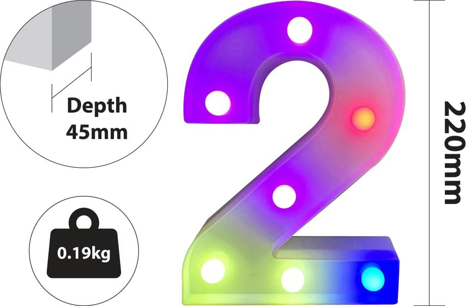 Introducing our vibrant RGB LED sign, a versatile addition to any celebration or ambiance setting. Powered by 2 x AA batteries (not included), this sign offers convenience with an on/off switch for easy operation. It comes complete with a user-friendly full-function timer remote control (powered by 1 x CR2025, not included), allowing precise control over colour selection, 9 program options, speed adjustments, and auto mode. Perfect for creating captivating night lights, enhancing parties, weddings, anniversaries, and birthdays, this sign provides endless opportunities to spell out names and ages with colourful flair. Elevate your events with the dynamic lighting possibilities of our RGB 9 LED sign.