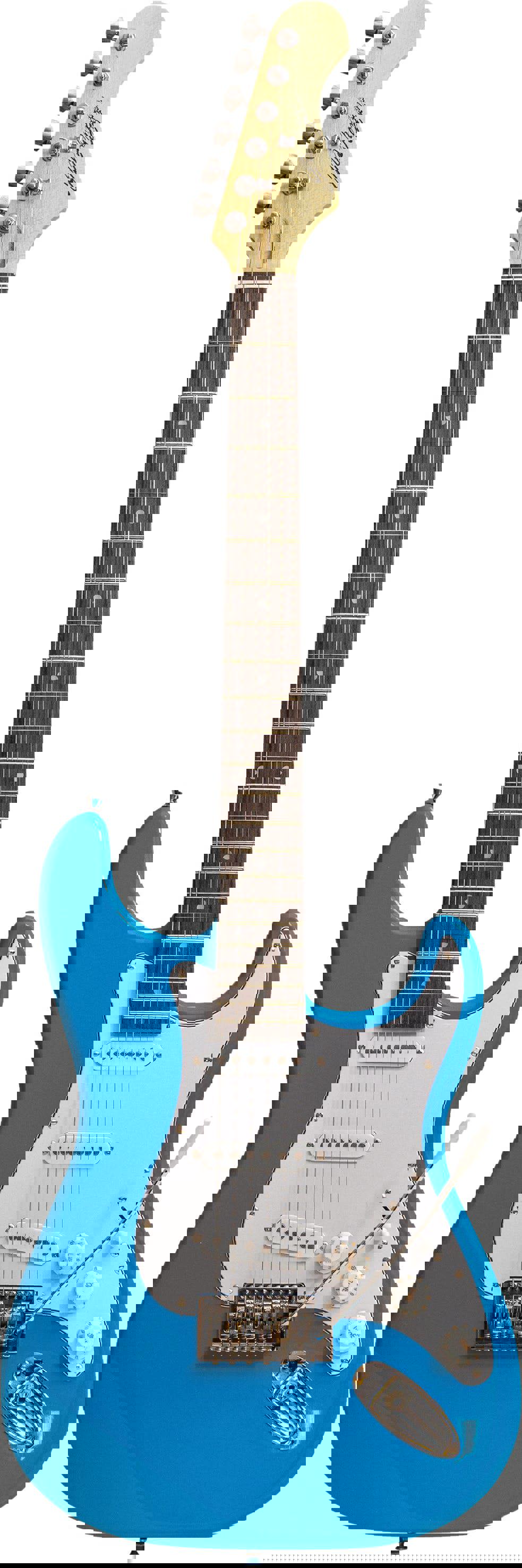 A high-quality standard electric guitar with high gloss finish, supplied with a 2. 4 metre jack lead. The guitar features a 22 fret maple neck, solid body, chrome machine heads, high gloss finish and 3 high quality single coil pickups . The guitar is supplied with a spare tremolo arm and adjustment tools for the trust rod and playing action.