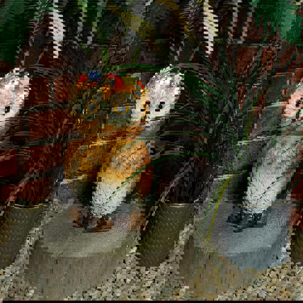 My name is Olive,I am a beautiful and quirky solar garden ornament, I'm a little bit special thanks to my solar light which will brighten up your garden and lawn at night, I am so economical, my light charges up during the day by absorbing sunlight, aren'tI clever. I'm avery charming ornament painted in beautiful, vibrant colours and I will enhance the look of any garden whether it be day or night, you will be the envy of your neighbours thanks to me. My bodyis made from durable resin making me waterproof and able to withstand harsh weather when placed outdoors,I really don't mind the rain. I don't know if you know this butI'm part of a collection, check outmy family members Hattie, Ophelia, Bella,Olive, Ruby and Frankie