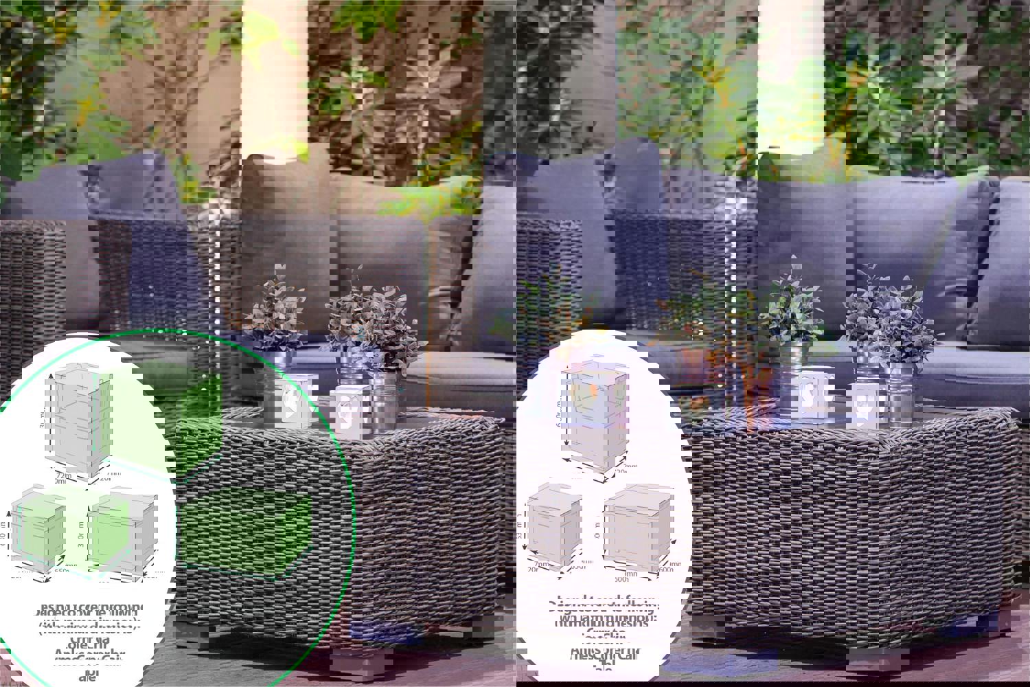 The 3 Piece Large Corner cover set is the ideal way to protect your garden furniture from the elements in the winter months. Supplied in a green, water resistant polyethylene the product features eyelets and nylon cord to ensure a snug fit. Includes: Corner Chair Cover - 72x72x63cm Armless Corner Chair Cover - 65x72x63cm Table Cover - 60x60x30cm