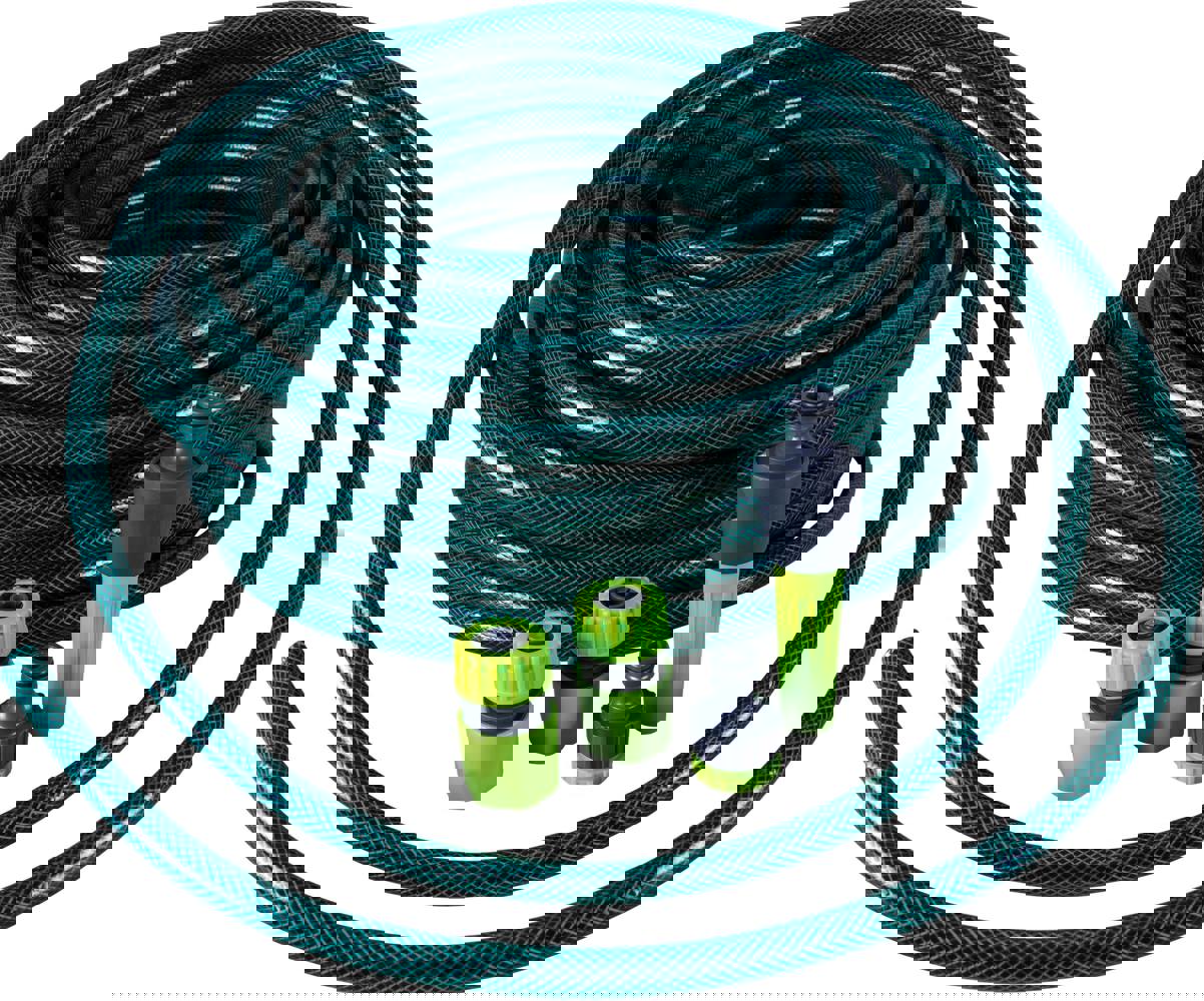 A hosepipe kit consisting of a length of reinforced hosepipe, a threaded indoor/outdoor tap connector, a hose end connector, a waterstop connector and a nozzle sprayer. The hosepipe is designed to fit all 13mm hose fittings. Ideal for watering your garden, washing your car and bathing pets etc. The hose pipe is reinforced to guarantee flexibility and strength. The kit is available with various lengths of hose, choose the hose length that suits the size of your garden.