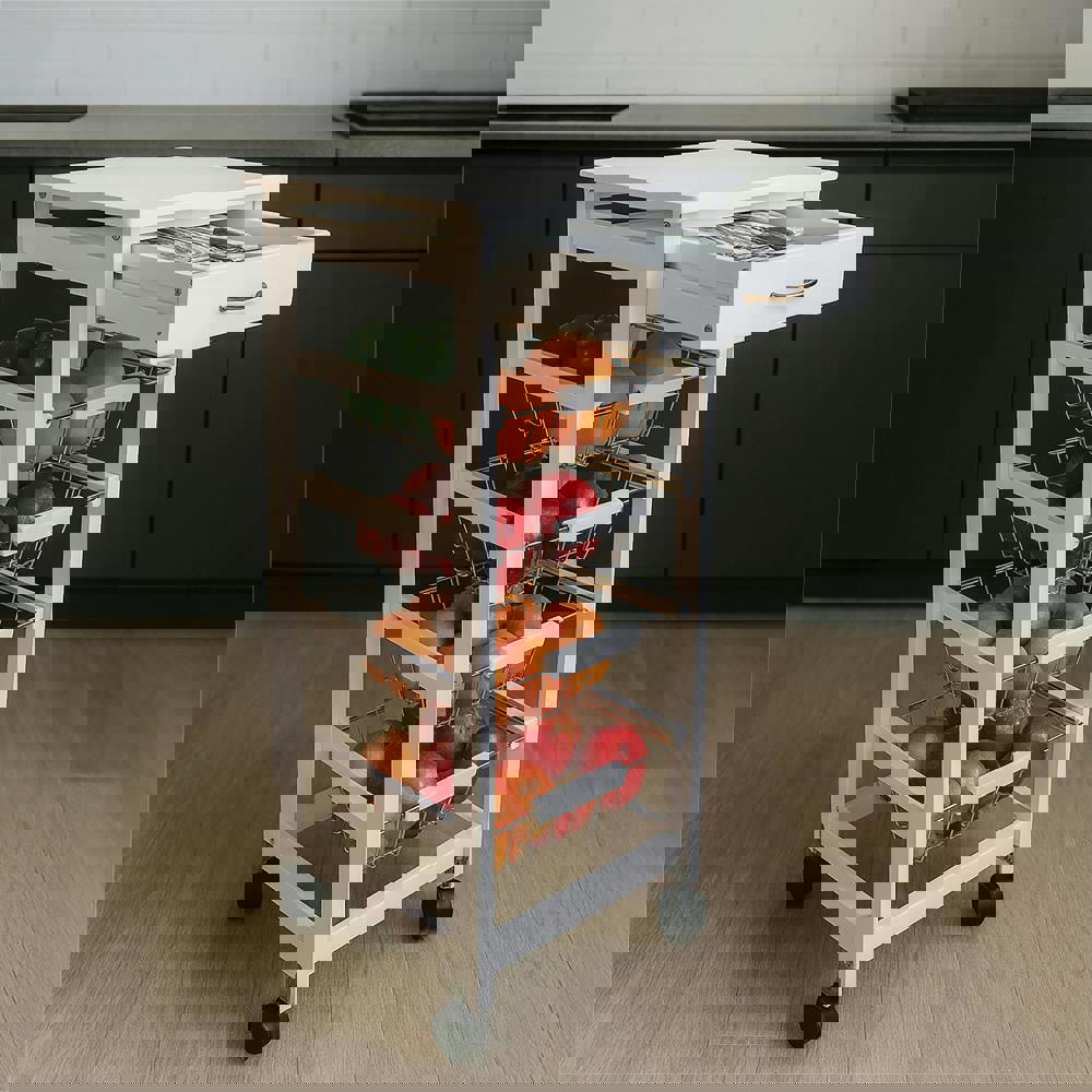 This kitchen storage trolley adds extra workspace and storage with a sturdy countertop, four pull-out baskets, and a handy drawer. Smooth-rolling castors make it easy to move, with lockable wheels for stability. Finished in clean white, it suits any kitchen style.