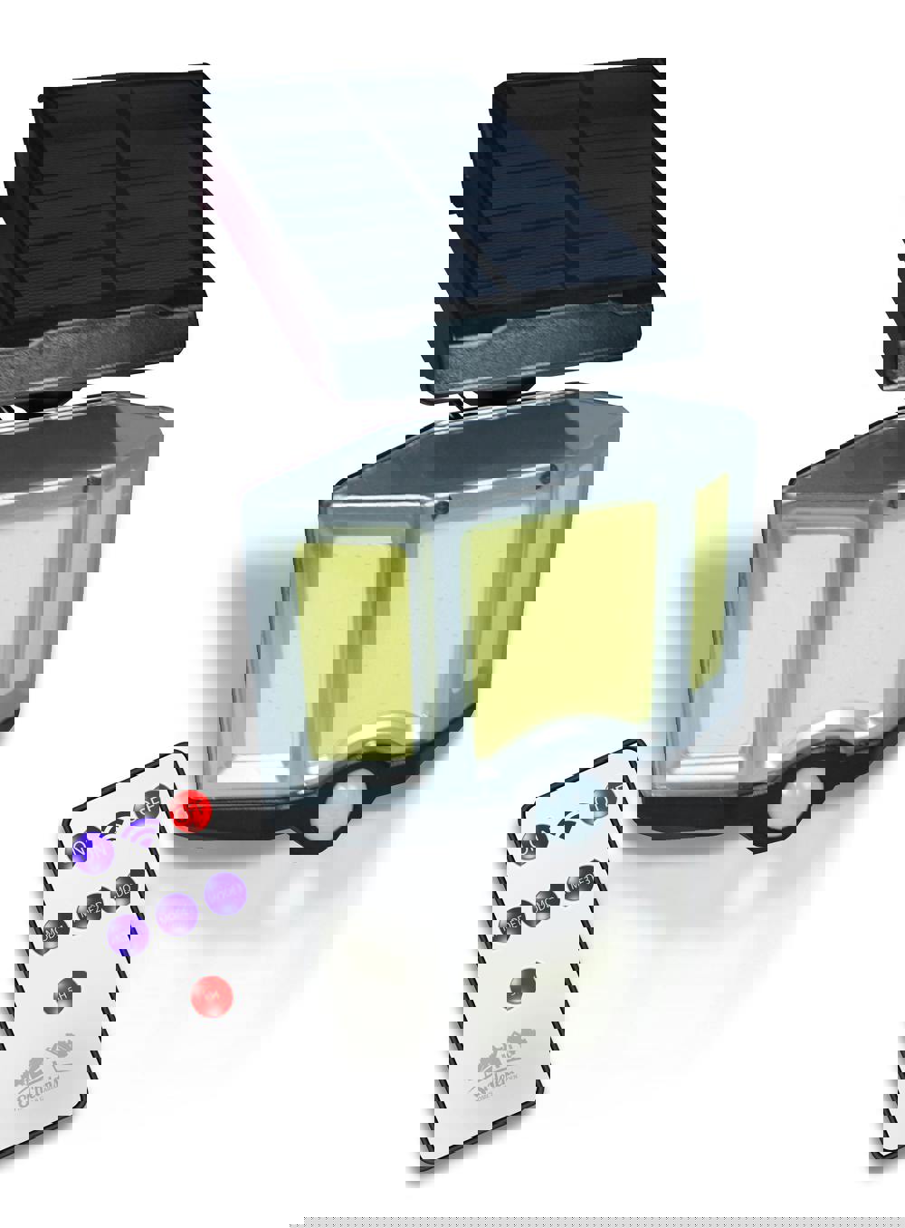 Solar powered security light with motion detector and remote control. The product is supplied with an easy mount bracket, fixing kit, 2400mA battery and large solar sell. The LED light rotates through 240 degs horizontally and 45 deg vertically to allow for accurate positioning of the light. The unit further features a remote control allowing the selection of Day/Night mode (light comes on when it goes dark and a switches off at day break), Security setting where the unit is activated by movement and stays on for 30 seconds after movement has stopped and all on when the light is switched on or off via the remote.