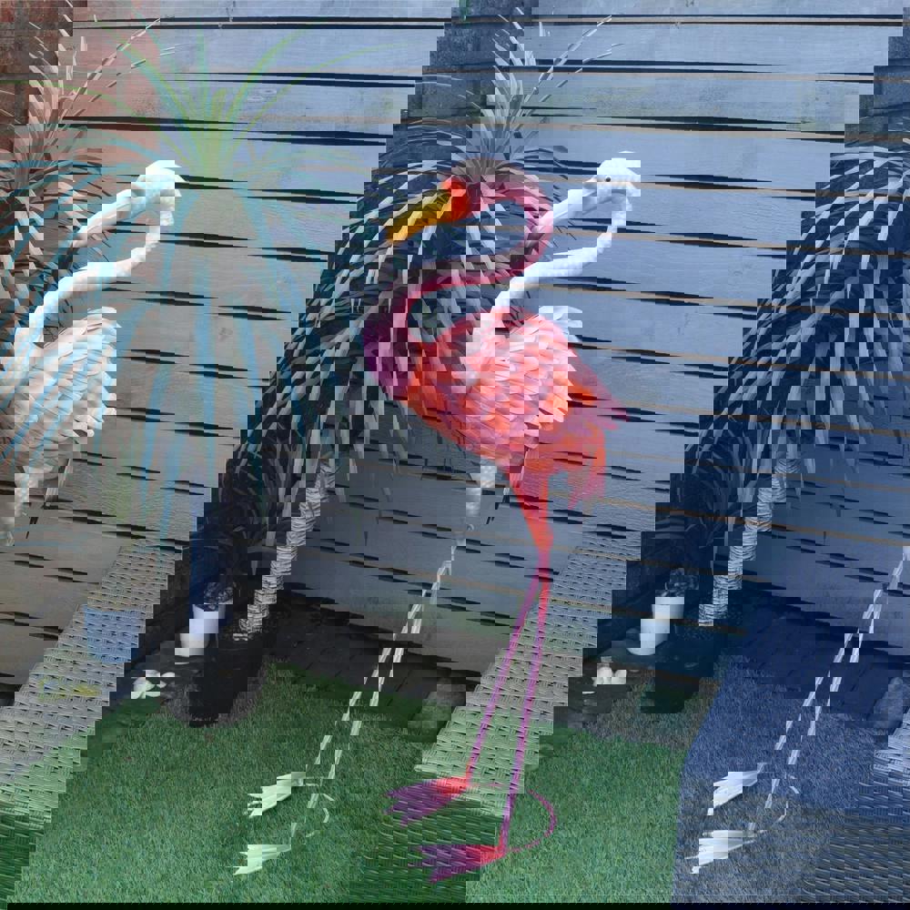 Add a tropical vibe to your garden, pond or home with this vibrantly coloured flamingo ornament. The flamingo can easily be secured into your lawn, pond, pot or border using u shaped pegs (not supplied), you could even display the flamingo indoors for themed parties or to add a pop of colour. Made from durable metal to ensure it can withstand even the harshest of weather conditions.