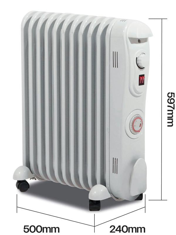 The Prem-I-Air 2. 5 kW 11 fin oil filled radiator with 24 Hour Timer features 3 heat settings, an adjustable thermostat, over-heat safety cut-out, a power indicator light, durable castors, a built-in carry handle and power cord storage. This product is only suitable for well insulated spaces or occasional use.